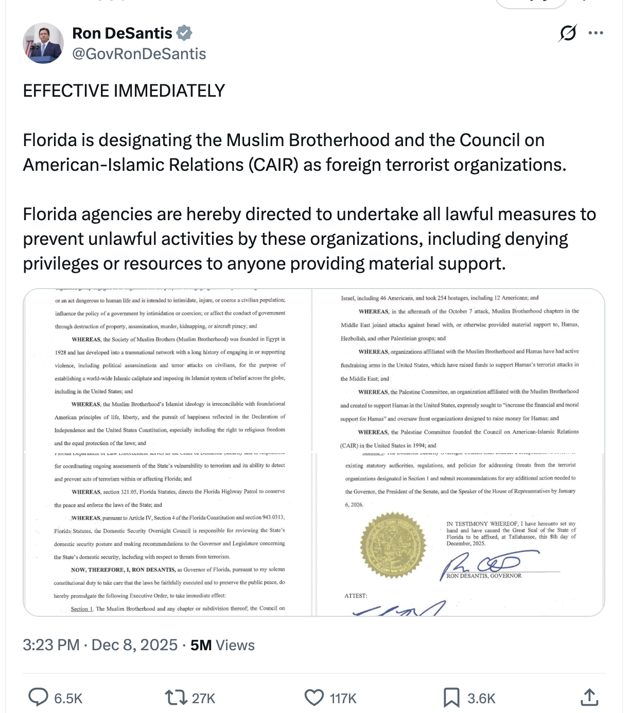 DeSantis and Abbott deserve credit for doing what Congress has avoided for decades: formally labeling the Brotherhood a terrorist organization and publicly calling out CAIR as part of that network.